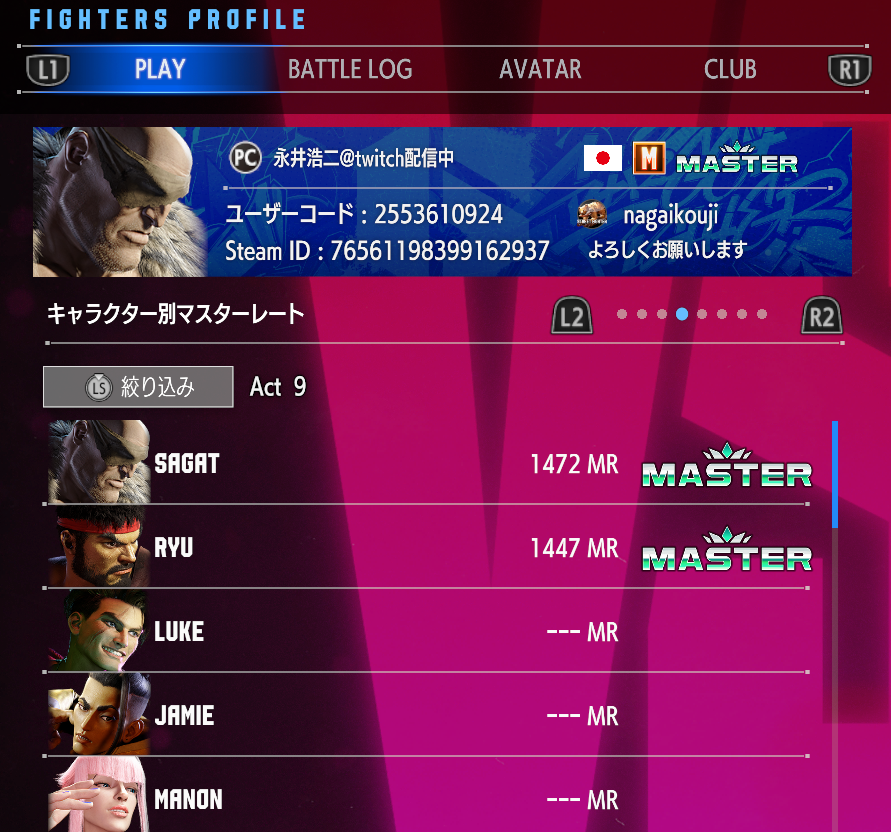 注意事項は 【 絞り込みの部分を必ずACT9での表示にしておいて下さい 】キャラクター別マスターレートの部分で表示して下さい